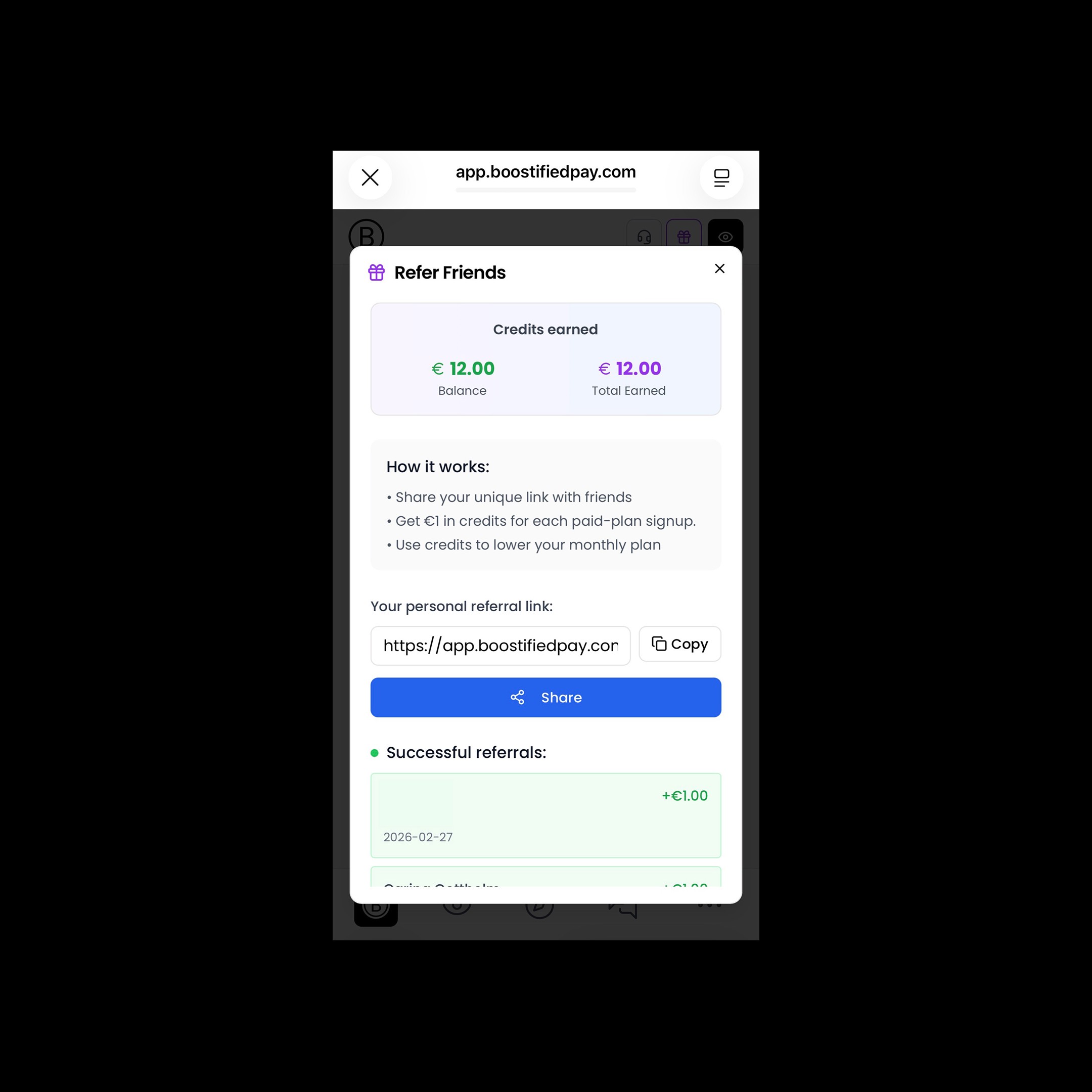 Inside BOOSTIFIED—Pay you’ll find your personal referral link. Share it with creators, brands, or anyone you think would benefit from the platform. When someone signs up through your link and starts a paid plan: